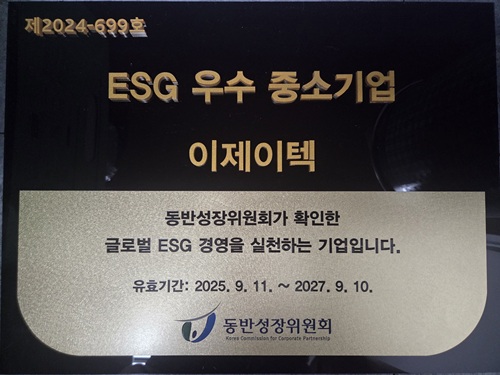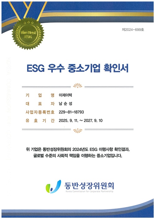글로벌 수준의 사회적 책임을 이행하는 ESG 우수 중소기업으로 선정되었습니다.