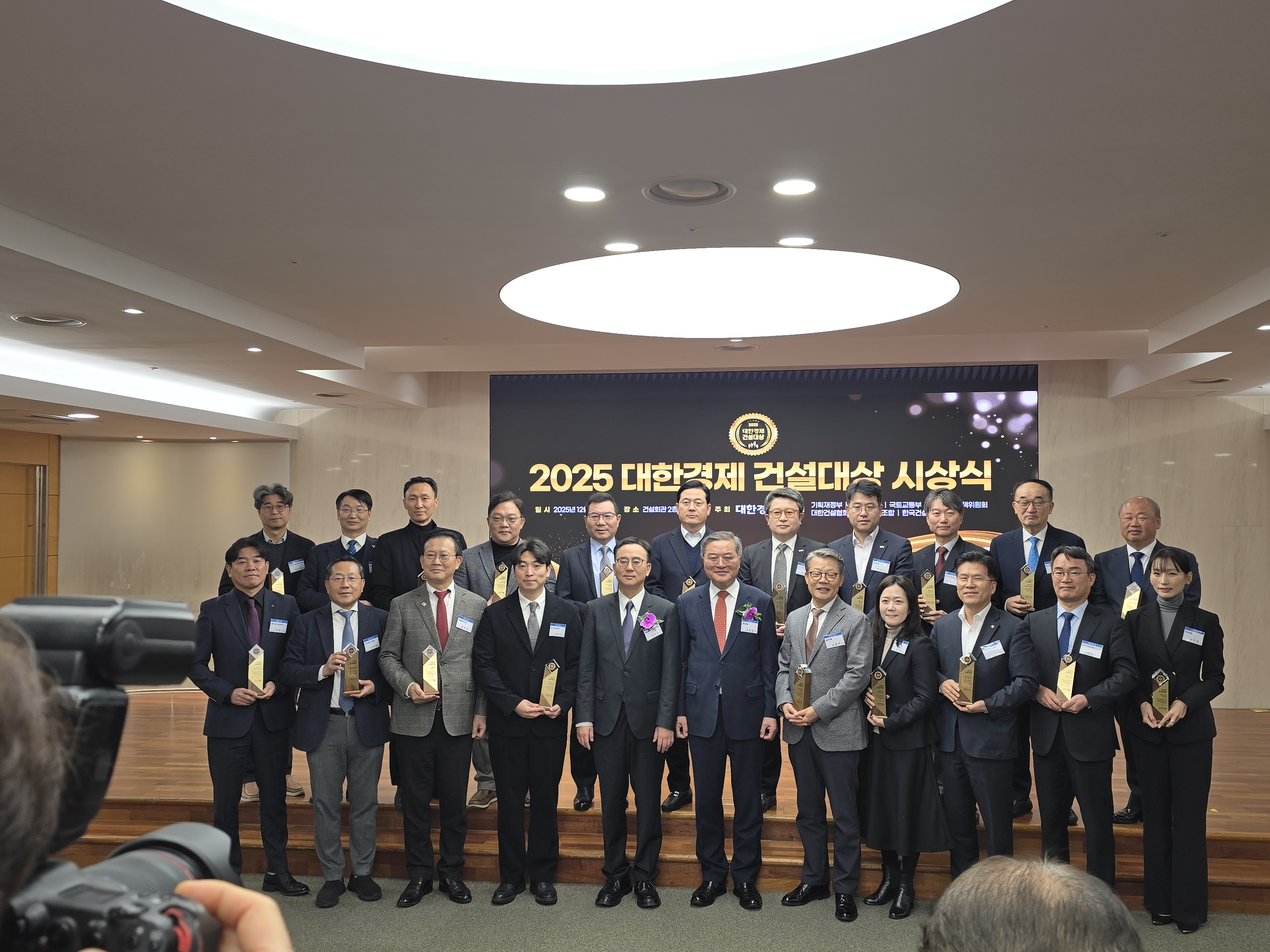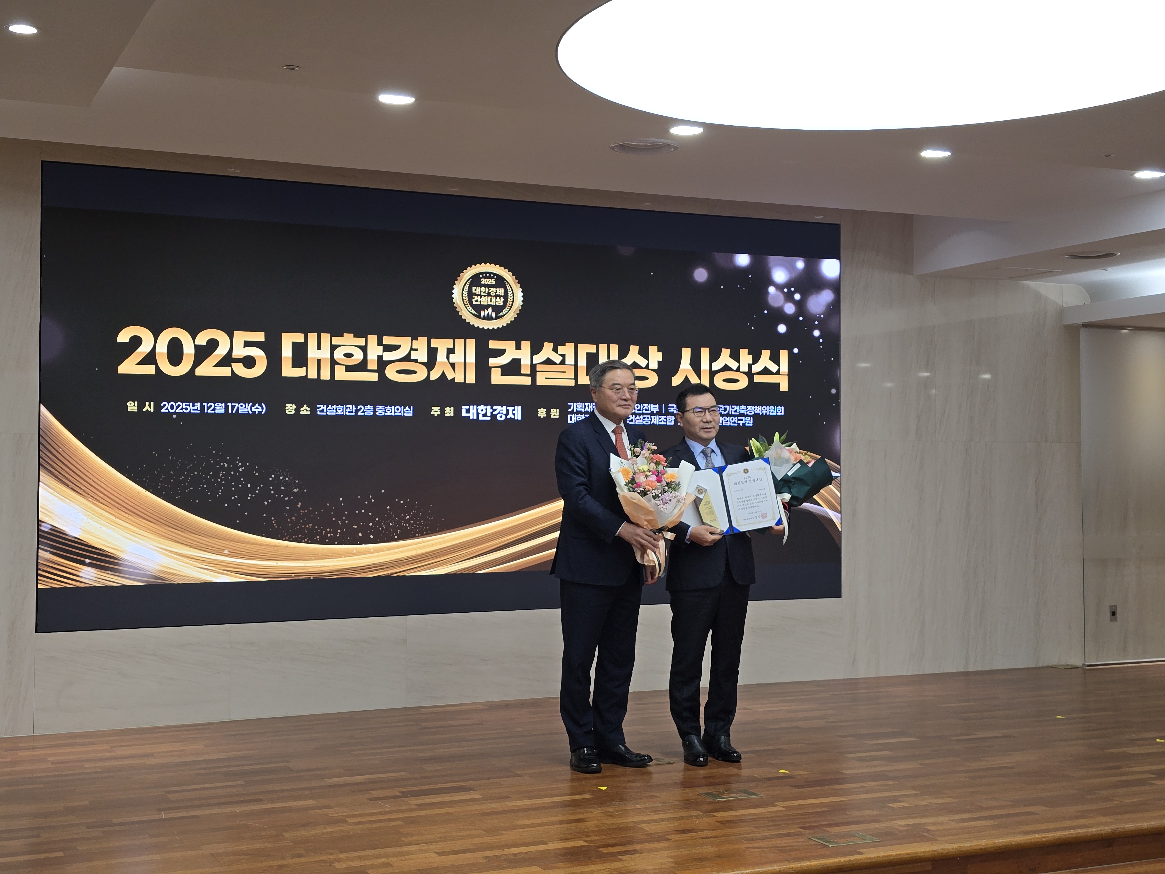 당사는 아래와 같이 2025 대한경제 건설대상을 수상하였습니다.임직원 여러분의 많은 축하 바랍니다.- 수상명 : 2025 대한경제 건설대상(스마트 건설부문)- 대상자 : (주)이제이텍(김완종 부회장)- 행사명 : 2025 대한경제 건설대상 시상식- 주최 : 대한경제- 일 자 : 2025년 12월 17일 (수)- 장 소 : 건설회관 2층 중회의실